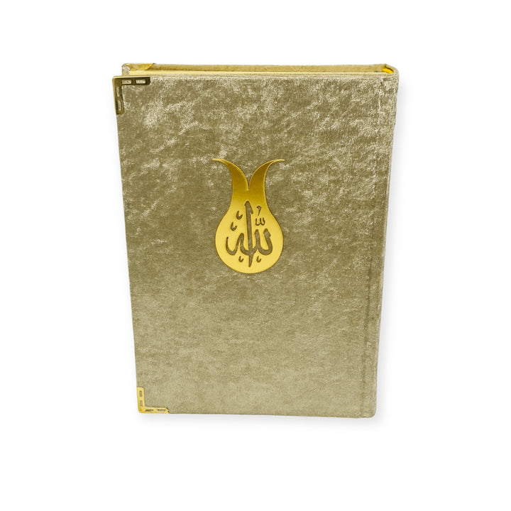 Qur`an covered with light blue velvet cloth and plexi arabic waaw letter stick on the quran cover.