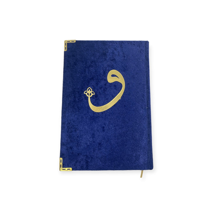 Qur`an covered with light blue velvet cloth and plexi arabic waaw letter stick on the quran cover.