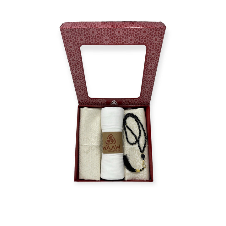 A beautiful gift set that includes a prayer mat, Tasbeeh (prayer beads), and a scarf. This could be a thoughtful and meaningful gift for someone who practices Islam.
