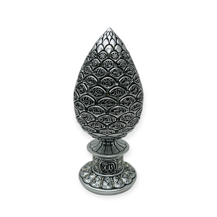 Enhance your home with this elegant Islamic table decor, featuring a golden pine cone design adorned with blue stones and crystal rhinestones. The 99 Names of Allah are beautifully inscribed, making it a meaningful and sophisticated centerpiece.
