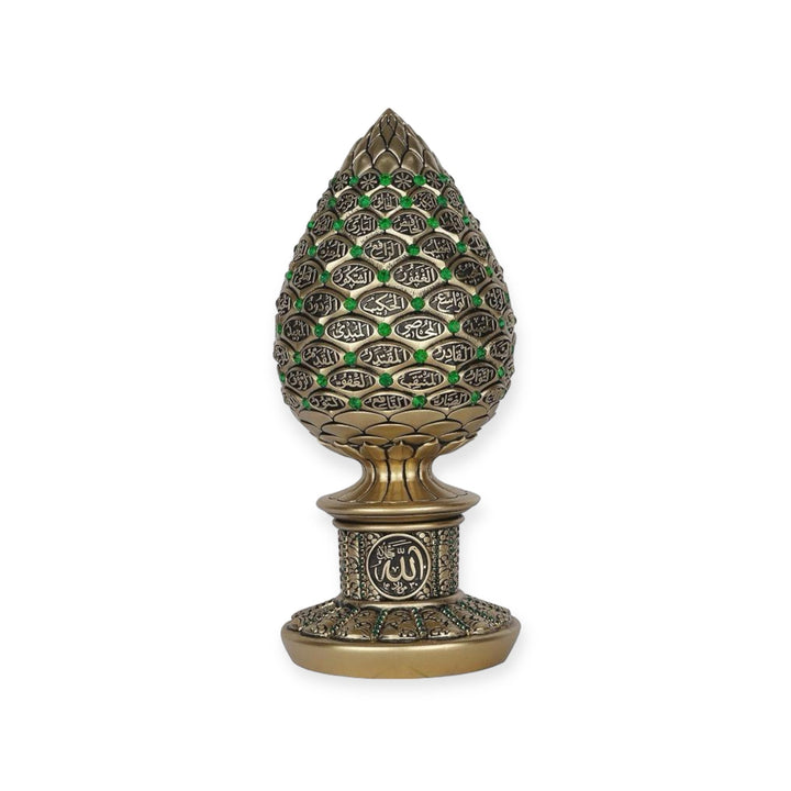 Islamic Table Decor Golden pine cone with green stones - 99 Names of Allah Alif collection