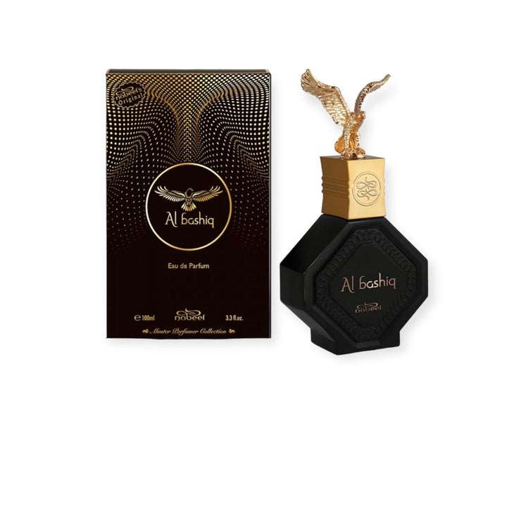 Packaging Details: Encased in an octagonal black matte finish bottle, crowned by a majestic falcon, Al Bashiq is a symbol of luxury. The fragrance is presented in an elegant rose gold foil embossed soft-touch paper box, reflecting your distinctive style.
