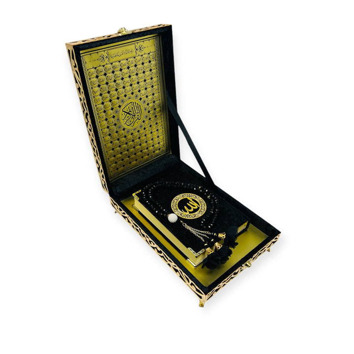 - Luxurious Velvet Wooden Box Quran Set: Includes a 15-line Indo Pak Quran, beautifully encased in a velvet-covered wooden box, and a matching Tasbeeh.